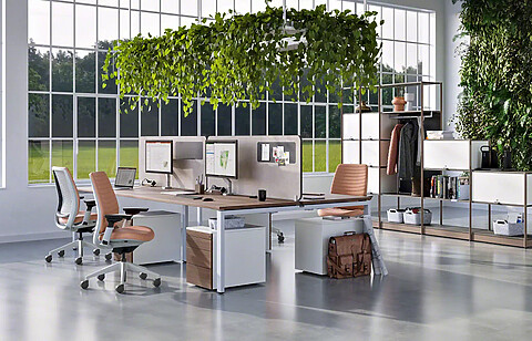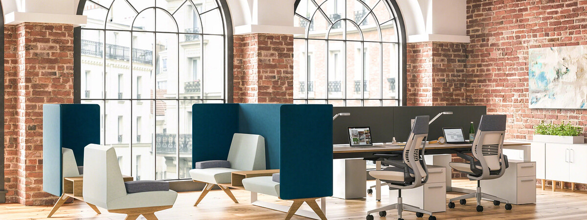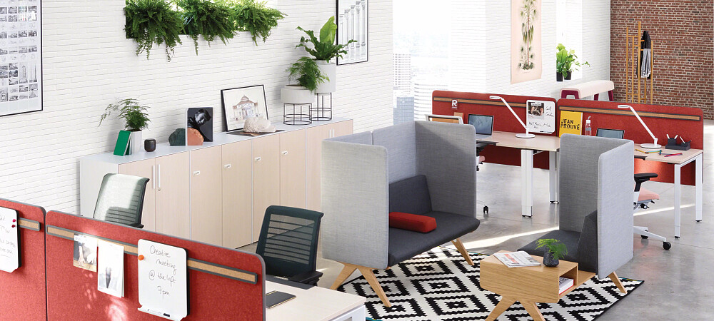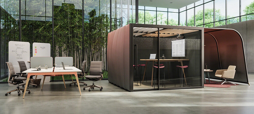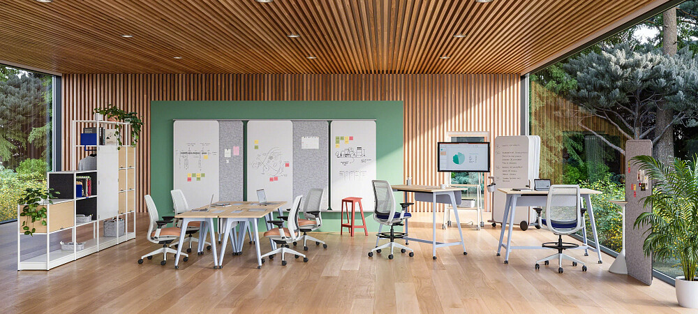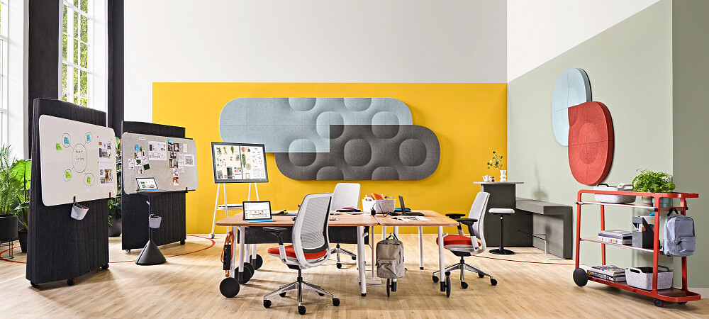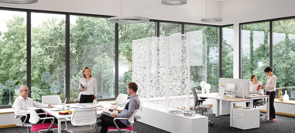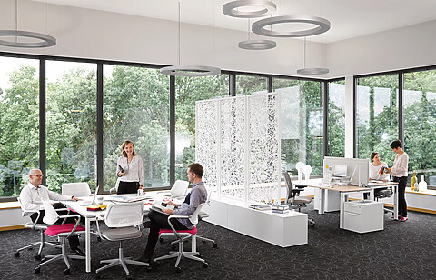 Da mehrere Personen in einem Raum arbeiten, ist eine gute Raumakustik entscheidend. Akustikpaneele, Stellwände und schallabsorbierende Möbel reduzieren Lärm und erhöhen die Konzentration.